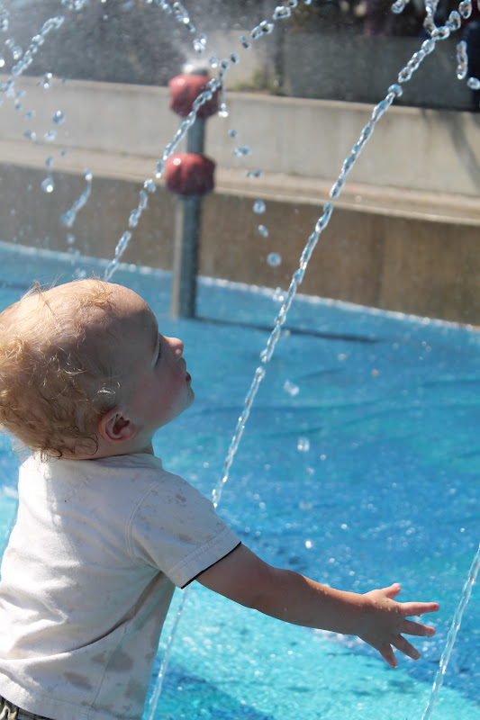 Kids are weird. Titus loves baths. He loves "swimming" in his pool in the backyard. He hates being in the big pool, at least at the last hotel we stayed at. He loves playing in sink water or water in a bowl with soapy suds. He was just okay with water popping out of the ground. It was like it was interesting, but not all that. To his mom, it is all water! I don't get it. Anyway, he did enjoy himself and had fun. I think it is one of those things he'll have to be introduced to again to really get the hang of it. He enjoyed watching the others kids and copying off them, although he did get knocked over a couple times.He mostly enjoyed feeling the pressure of the water coming out of the ground with his hand.